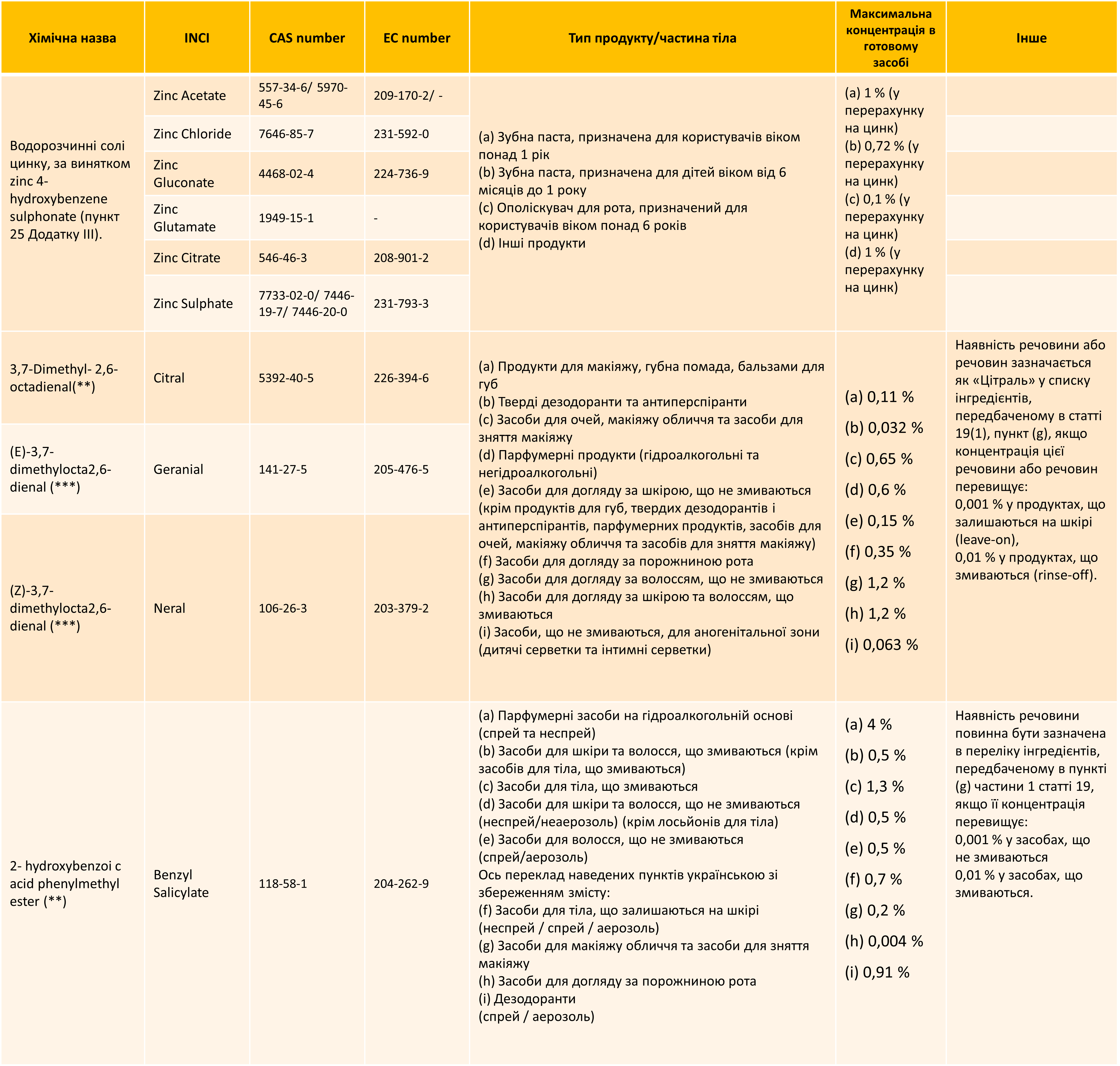 • Водорозчинні солі цинку, за винятком zinc 4-hydroxybenzene sulphonate — змінене обмеження.