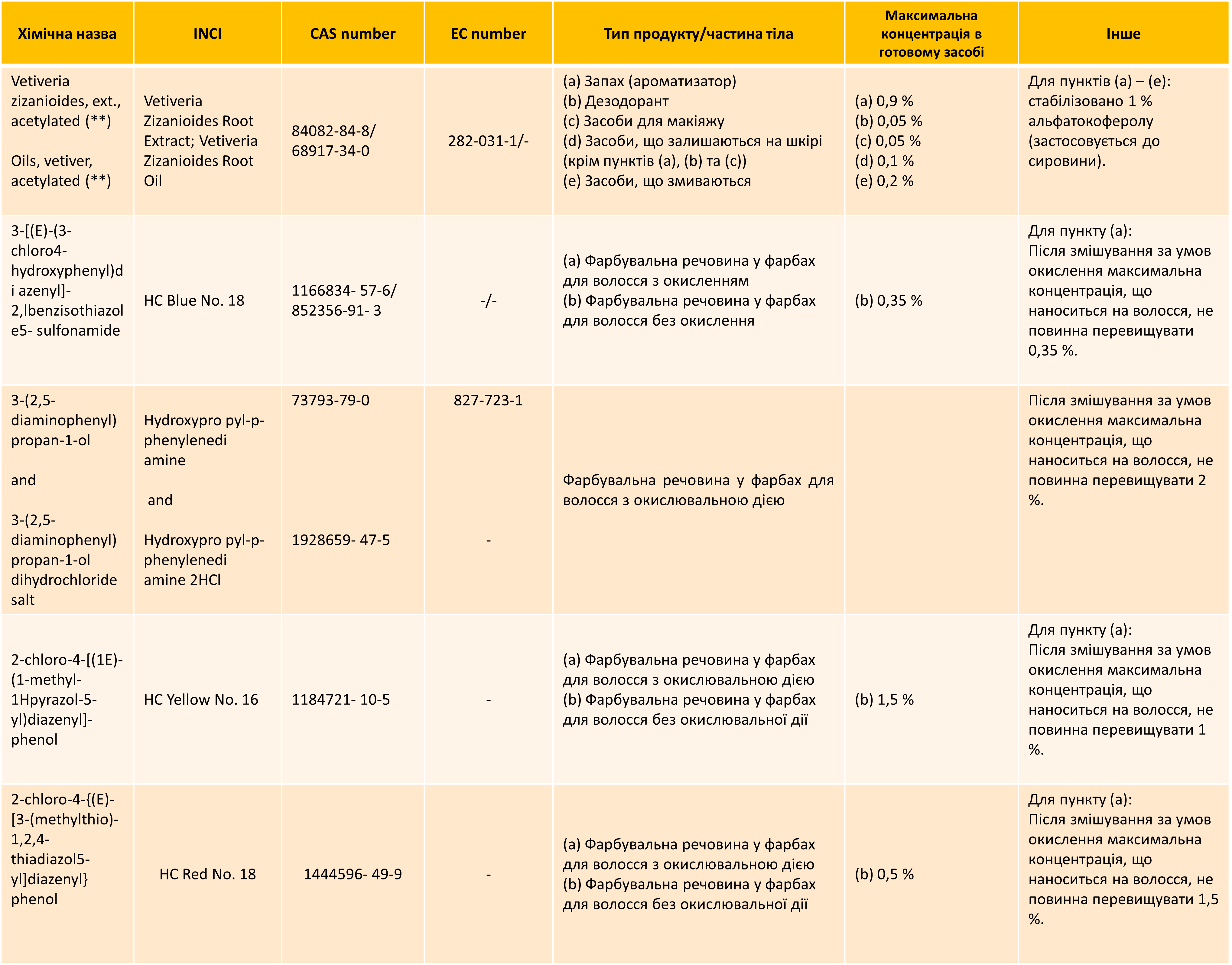 Нове обмеження для HC Blue No. 18, Hydroxypropyl-p-phenylenediamine, HC Yellow No. 16, HC Red No. 18.