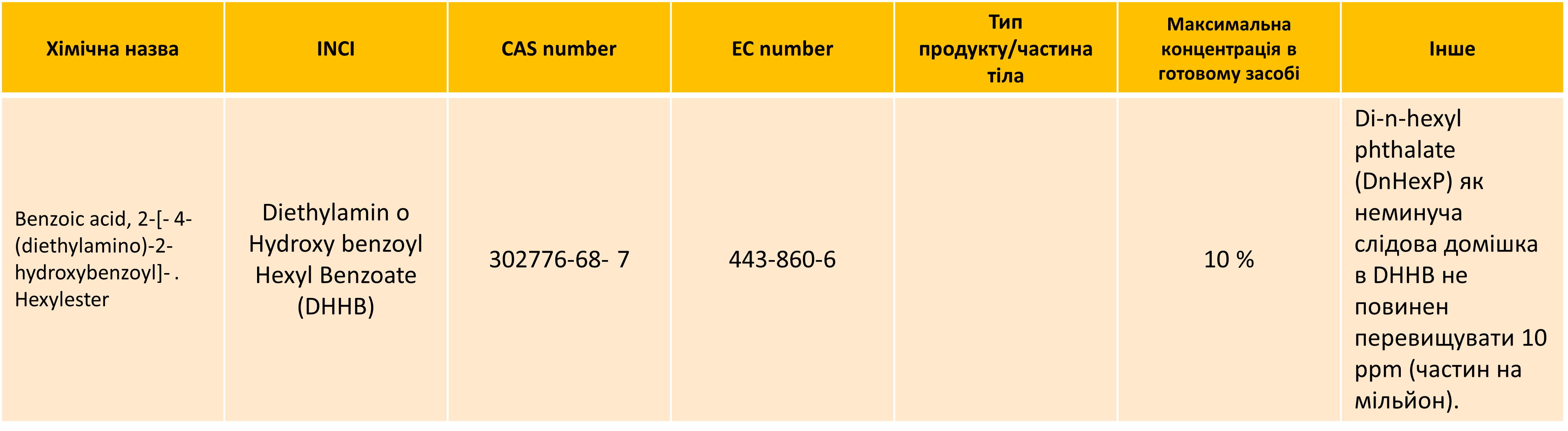 • Зміна запису щодо UV-фільтра Diethylamino Hydroxy benzoyl Hexyl Benzoate (DHHB).