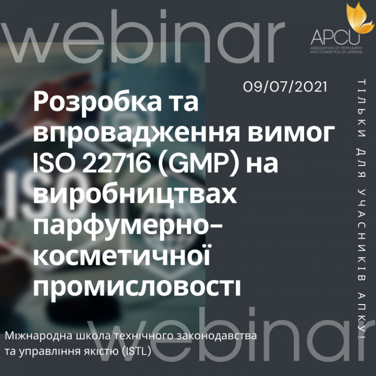 Починаємо квартал з вебінару для учасників АПКУ «Розробка та впровадження вимог ISO 22716 (GMP) на виробництвах парфумерно-косметичної промисловості» від ISTL